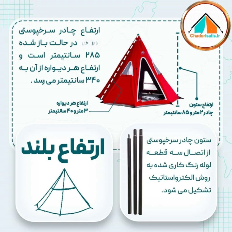 ارتفاع ستون چادر در حالت باز شده : ۲۸۵ سانتی متر