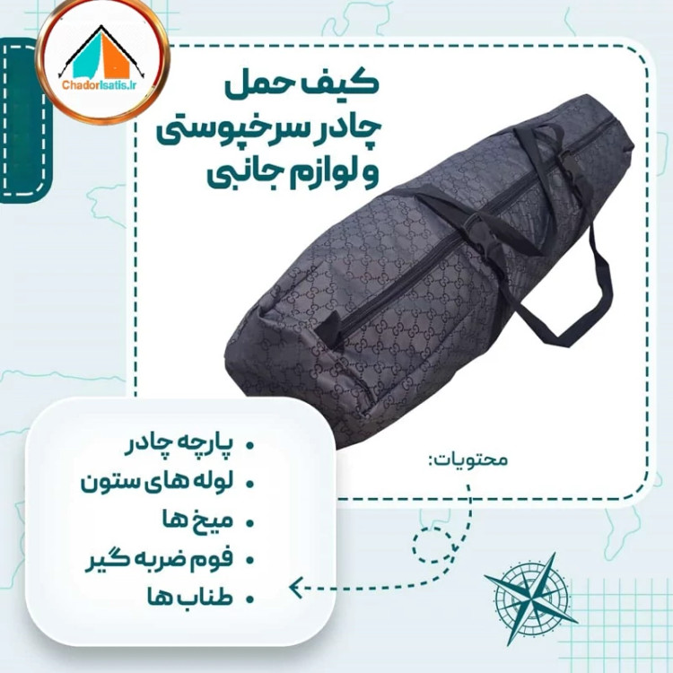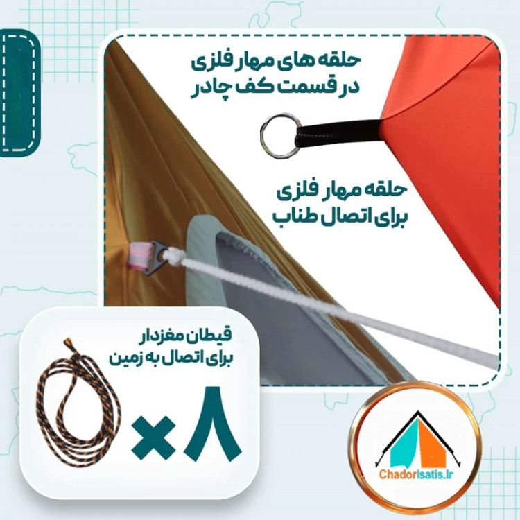 داخل چادر دارای دو جیب بزرگ تعبیه شده برای تلفن و دیگر لوازم, دارای ۸ رشته قیطان مغزدار برای اتصال به زمین, دارای ۱۶ میخ مهار چادر و کف چادر به همراه کیف مخصوص