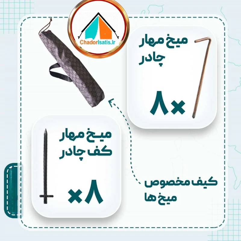 داخل چادر دارای دو جیب بزرگ تعبیه شده برای تلفن و دیگر لوازم, دارای ۸ رشته قیطان مغزدار برای اتصال به زمین, دارای ۱۶ میخ مهار چادر و کف چادر به همراه کیف مخصوص