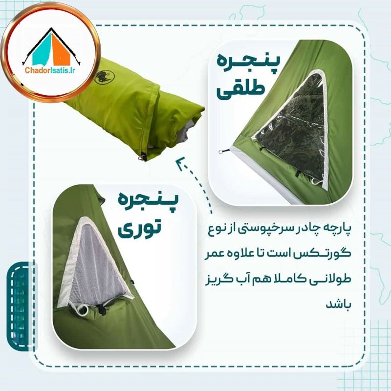 کف این چادر کاملاً ضد آب است و با ابعاد حدود ۳۸۰×۳۸۰ سانتیمتر، فضای کافی برای خواب و استراحت چندین نفر را فراهم میسازد. وجود ۱۶ میخ مهار، ۸ رشته قیطان مغزدار و دو جیب داخلی بزرگ برای نگهداری لوازم ضروری مانند موبایل یا چراغقوه از دیگر مزایای این چادر است. همراه با چادر، کیف مخصوص حمل نیز ارائه میشود تا جابهجایی آن آسانتر شود.