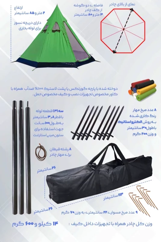 وزن کل چادر همراه با تجهیزات داخل کیف ۱۴ کیلو و ۶۰۰ گرم